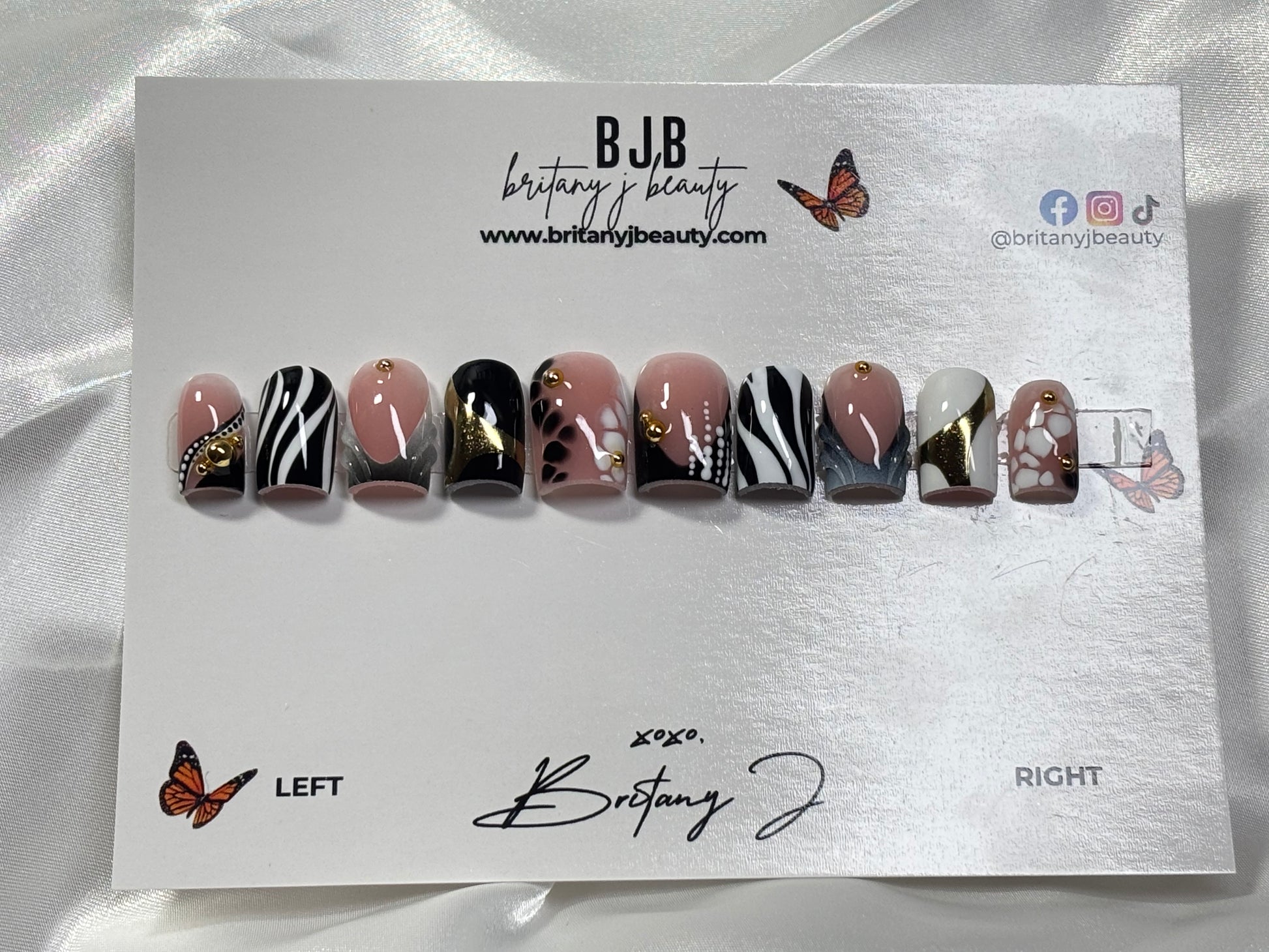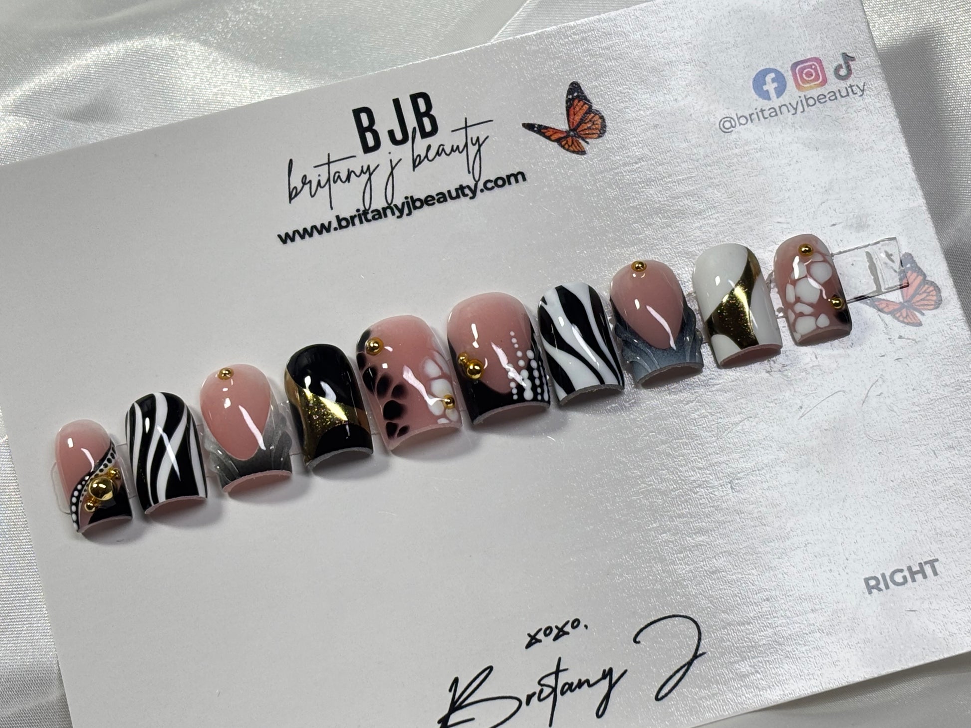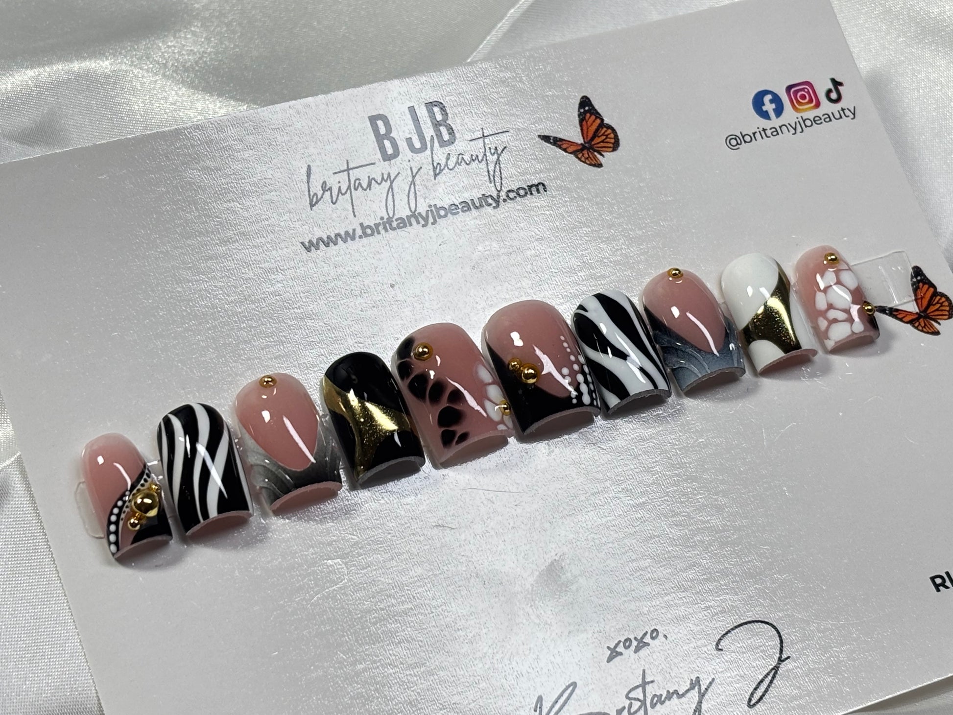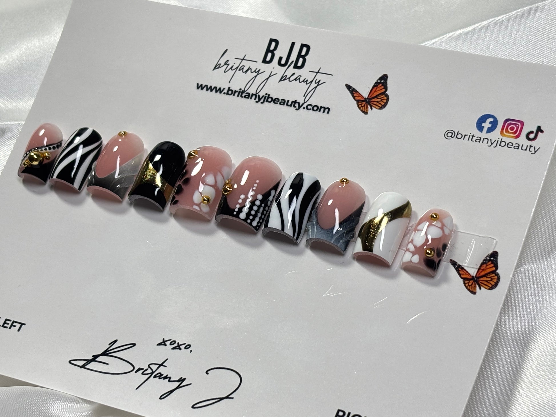 Step into your soft-luxury era with Abstract Dreamz, the set made for the ones who move with confidence and creativity. This design blends bold contrasts, smooth flow, and just the right amount of gold to give that effortlessly elevated vibe. It’s artsy, it’s mysterious, and it’s giving “I don’t follow trends — I create them.” Abstract Dreamz is here for the days when you want your nails to speak before you do. A little bold, a little dreamy, and fully main-character energy.