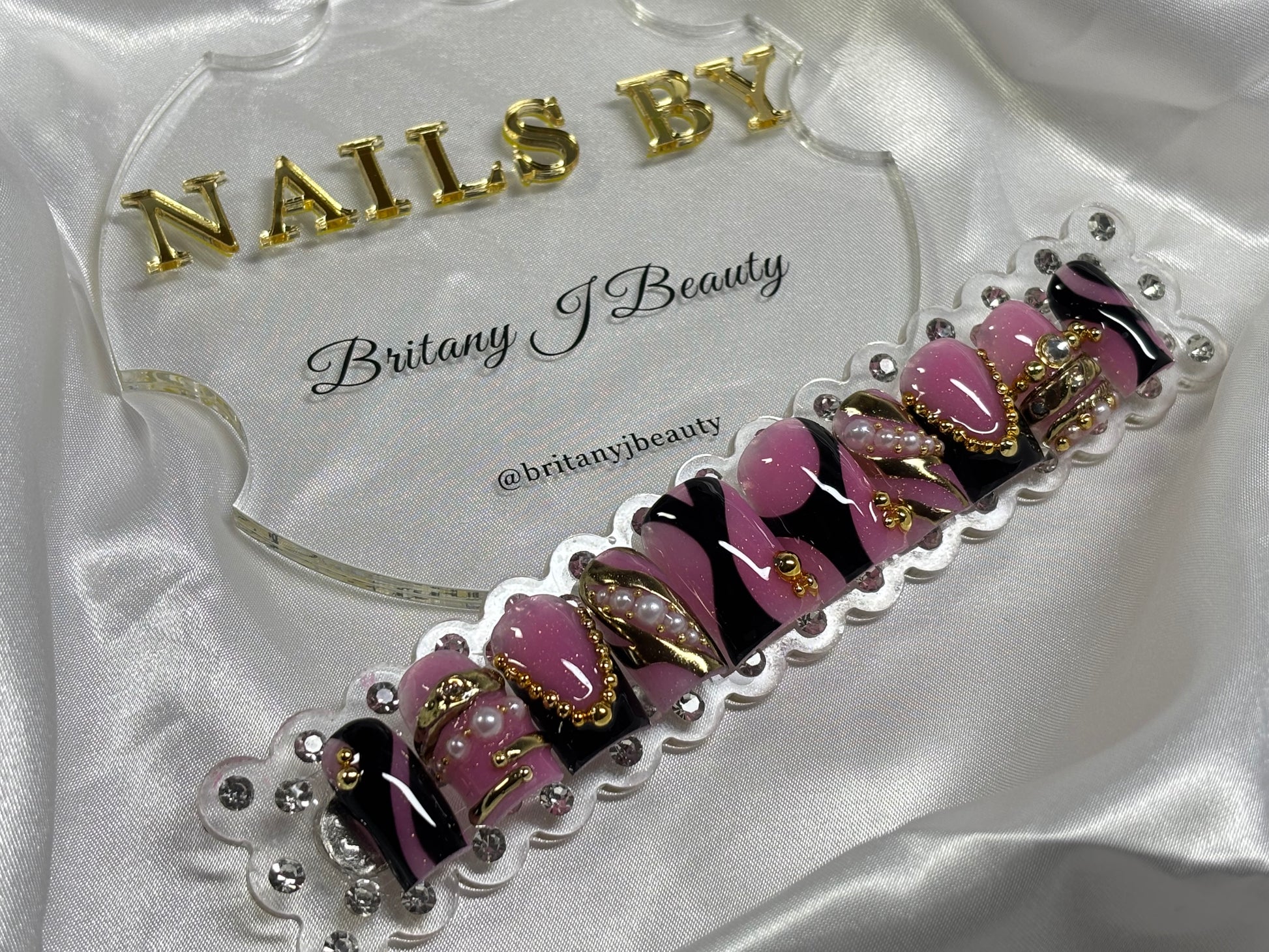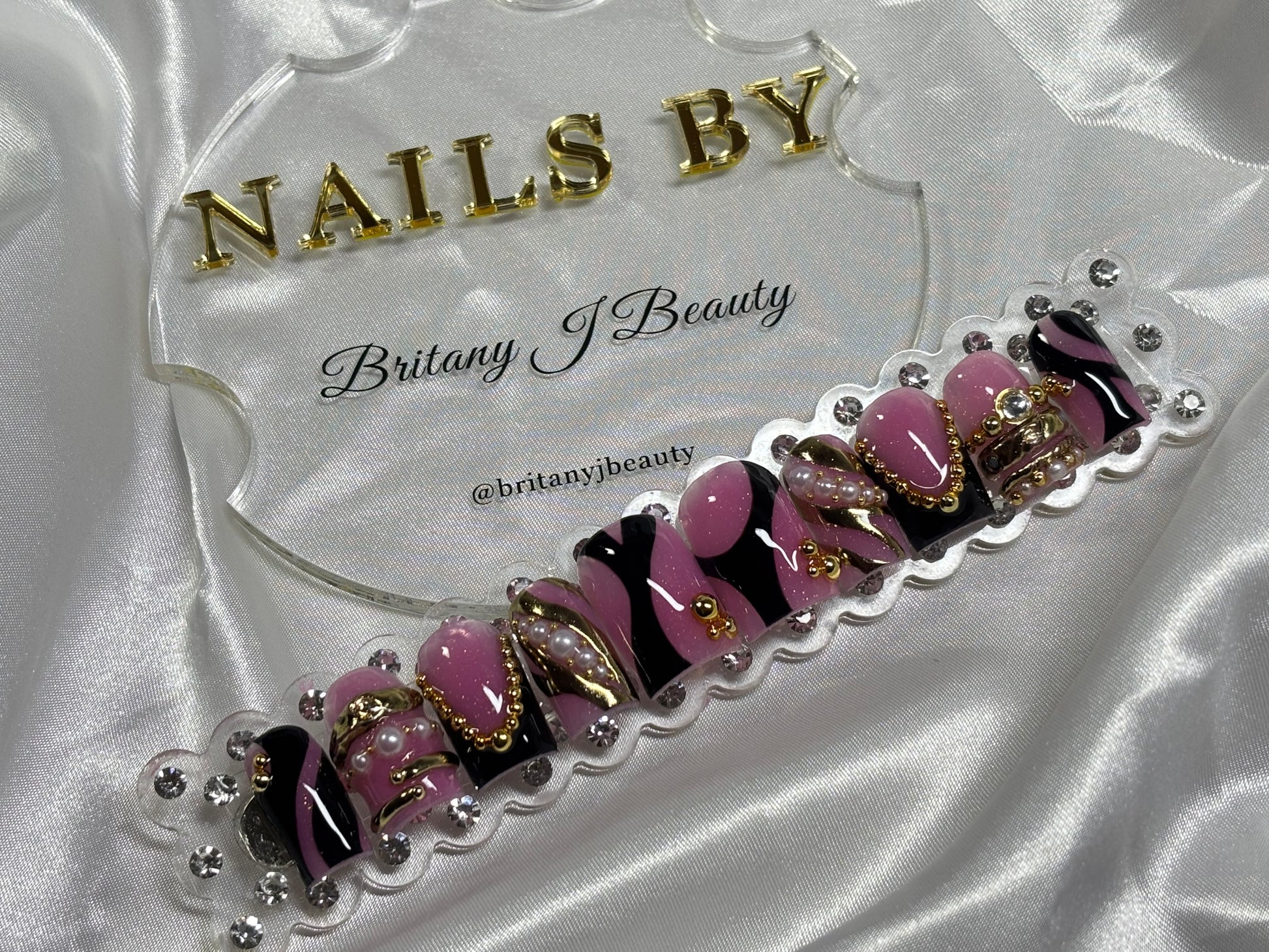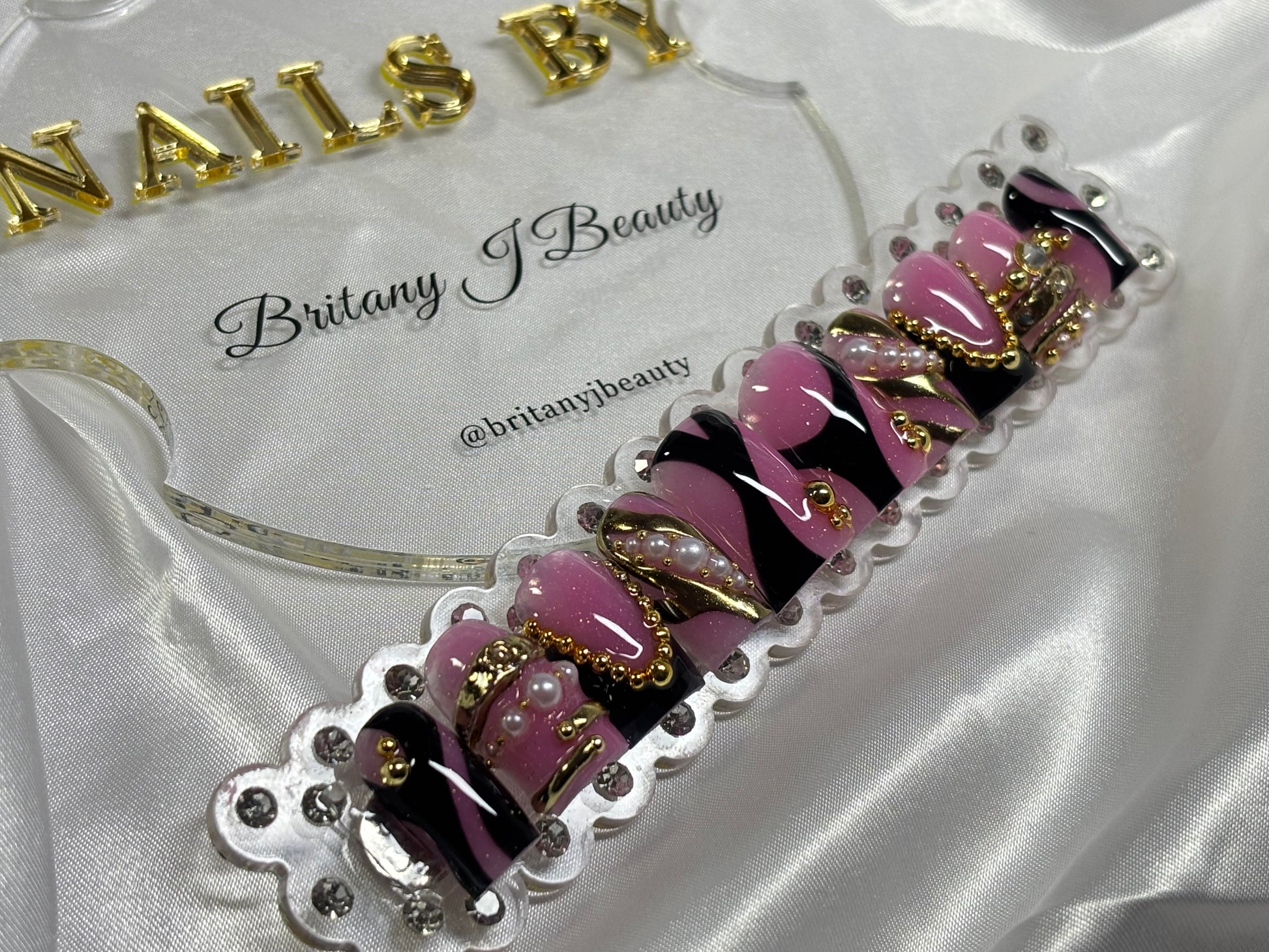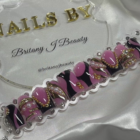 Step into every room like you own it with Boardroom Baddie. This handcrafted press-on nail set blends bold pink and black swirls with luxe gold chain accents, pearls, and high-shine details for a look that commands attention without saying a word. Perfect for work trips, power lunches, content shoots, or any time you want to bring CEO energy to your nails. Each set is custom-made for a flawless fit and long-lasting wear — because your nails should feel just as powerful as you do.