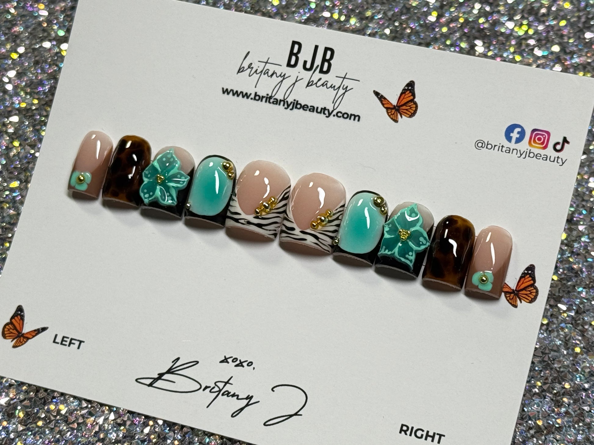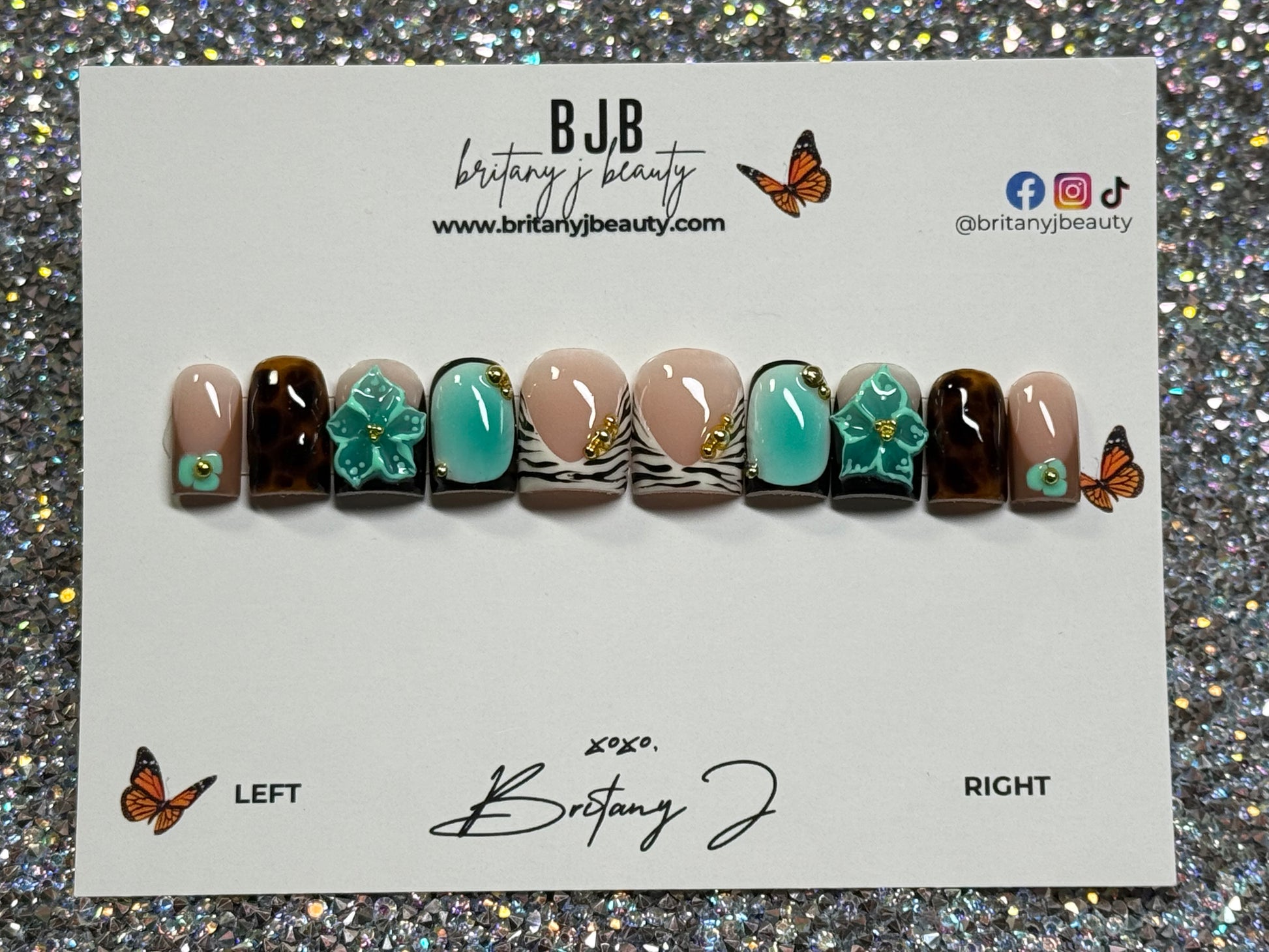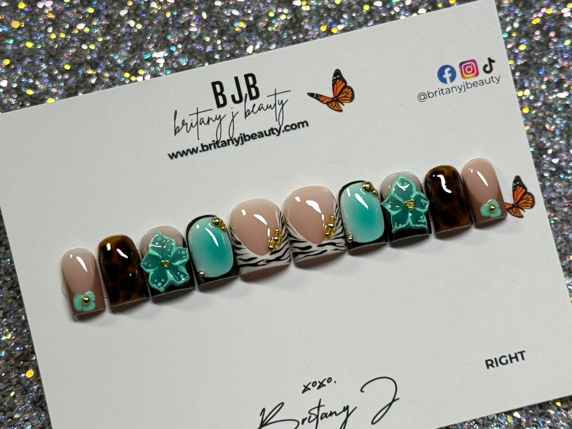 Step into autumn with confidence in Rich Couture, a bold press-on nail set that blends untamed prints with luxe details. Featuring tortoiseshell accents, zebra stripes, and striking teal florals, this set is where wild energy meets seasonal elegance. Gold embellishments and glossy finishes tie it all together, giving you a look that’s fierce, fashion-forward, and fall-ready.