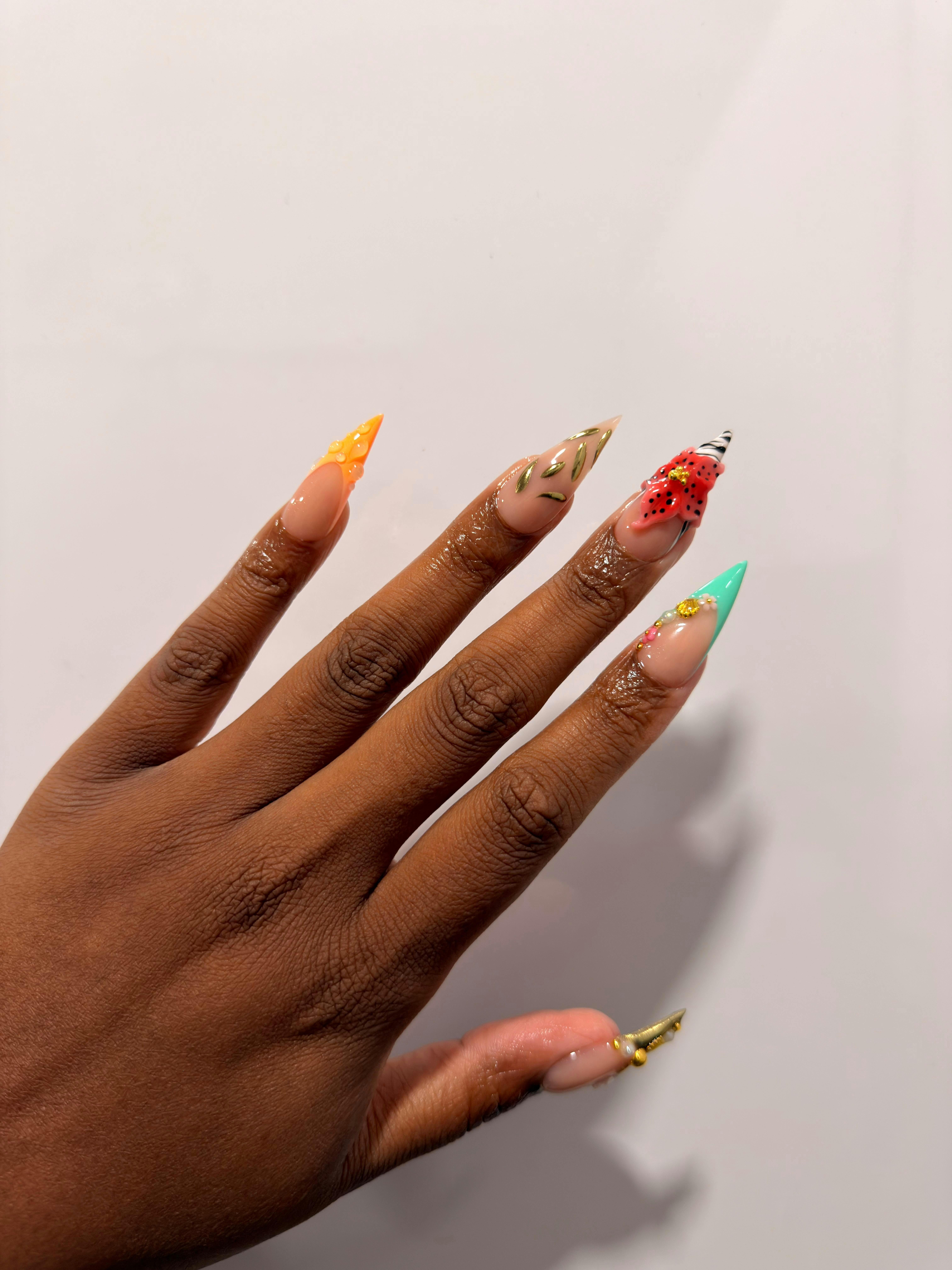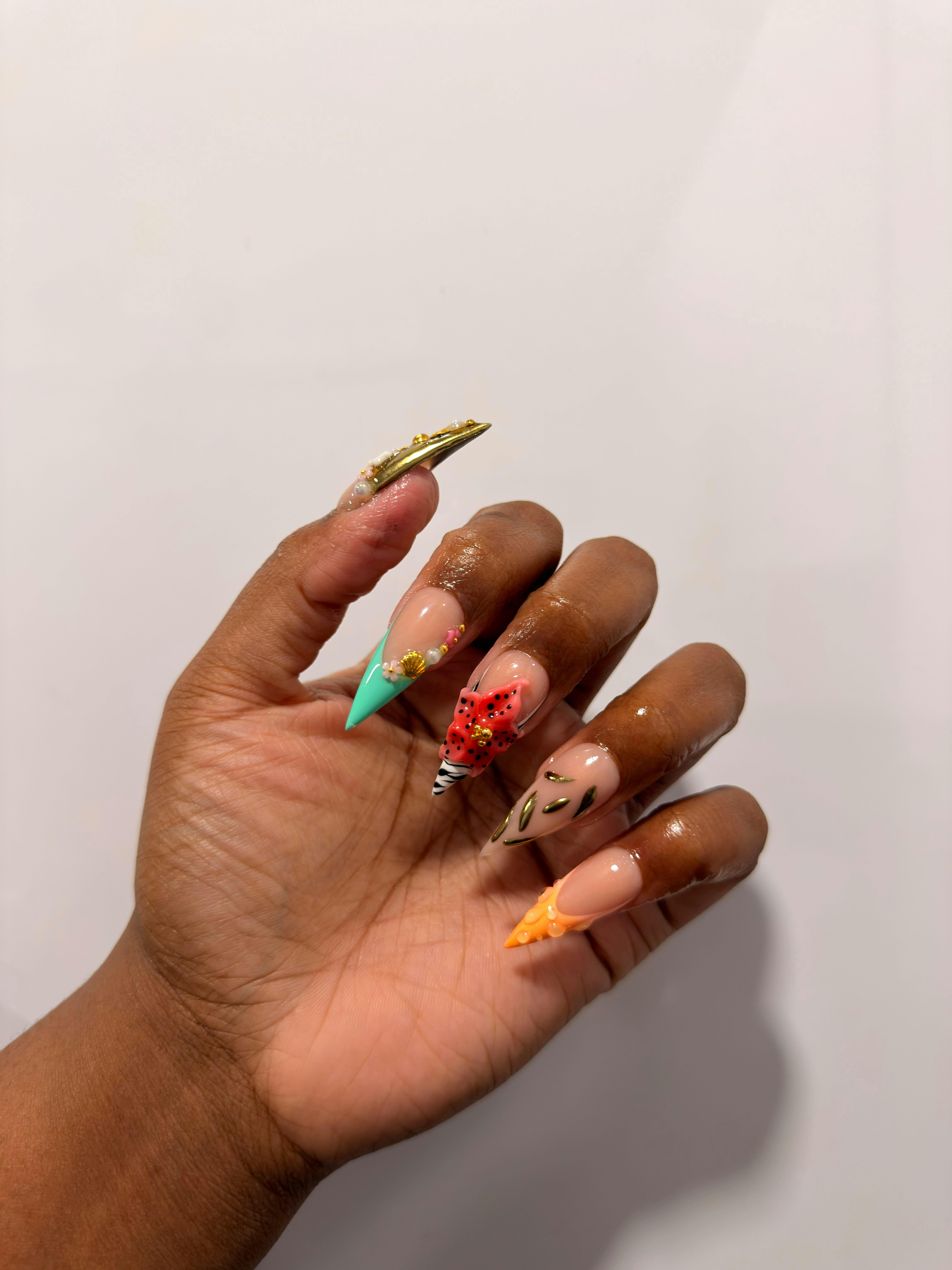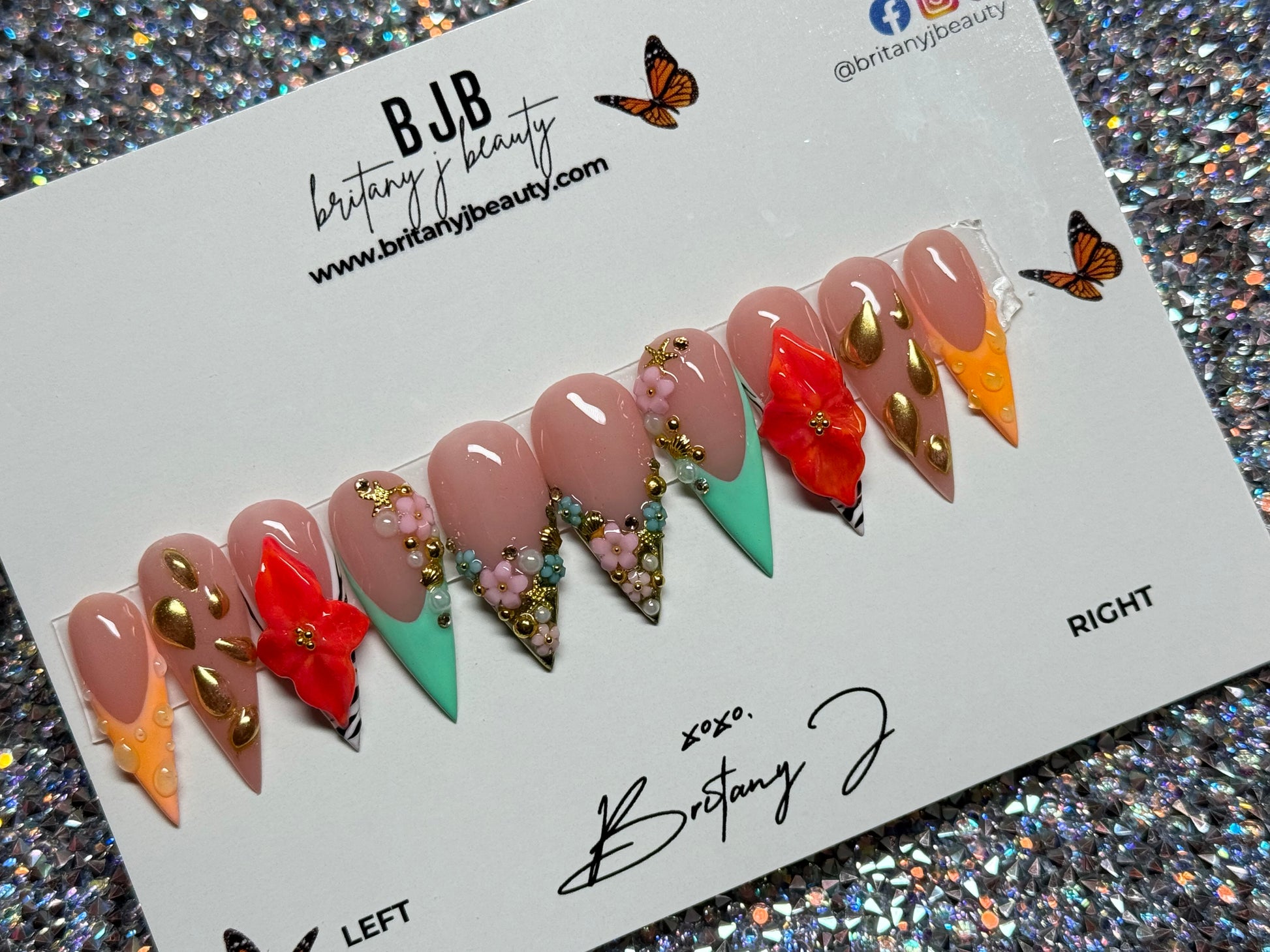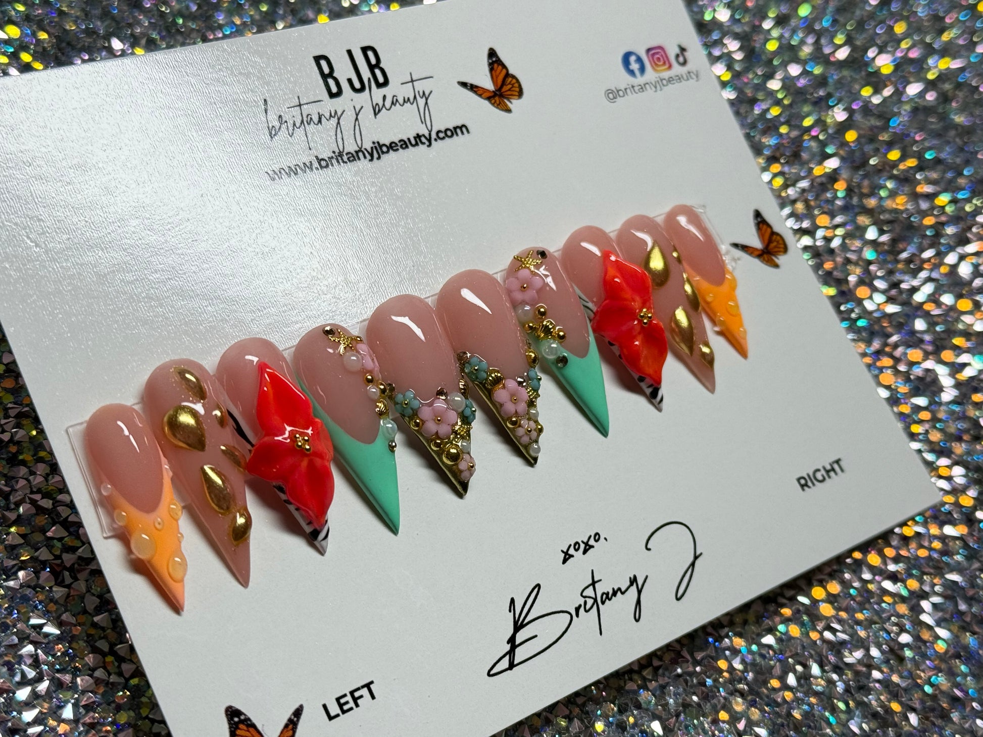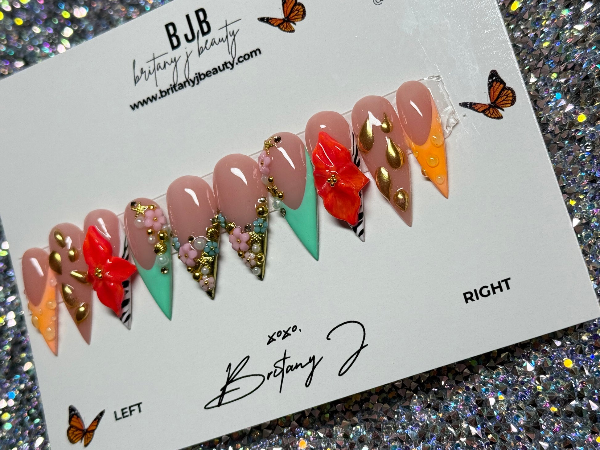 This set is giving full tropical takeover 🌺🍹 Our Jungle Juice press on nails feature a fierce mix of neon orange, mint green, zebra print, gold chrome drops, and 3D floral designs—all handcrafted for bold, vacation-ready glam. Each nail is layered with detail—from sculpted flowers and gemstones to bright color pops that bring that island energy to life. This isn’t just a nail set—it’s a whole mood.